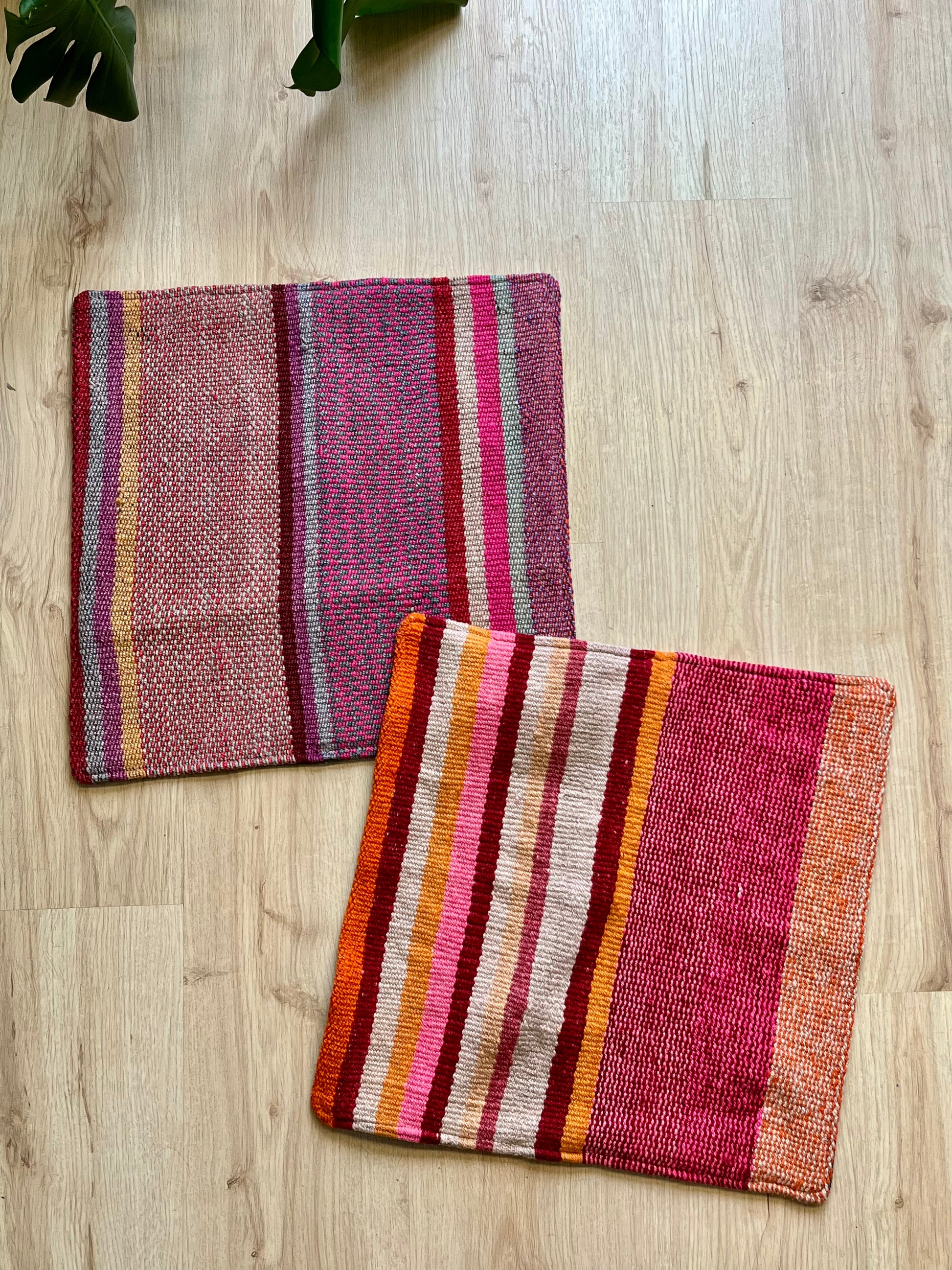 Die "Frazadas" werden auf "Rückengurtwebstühlen" gewebt, die an einem Ende an einem Holzpfahl und am anderen Ende an der Taille des sitzend arbeitenden Webers befestigt sind. Diese sehr authentischen "Frazadas" sind nicht homogen, so dass die Kissen leicht voneinander abweichen können.